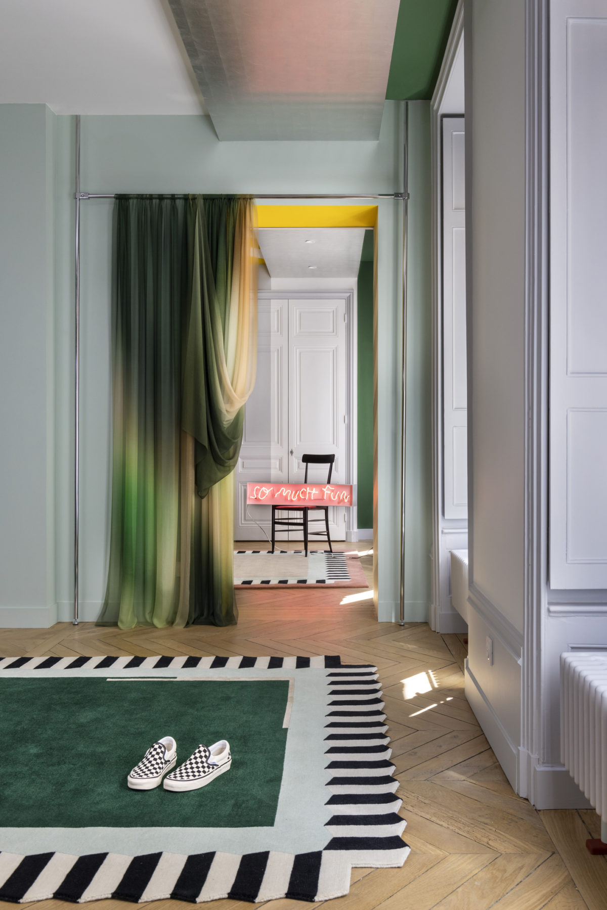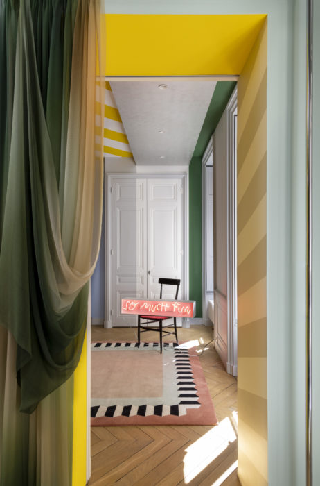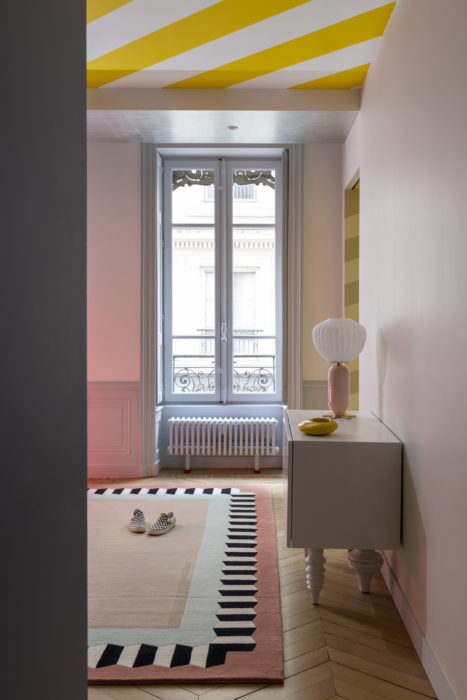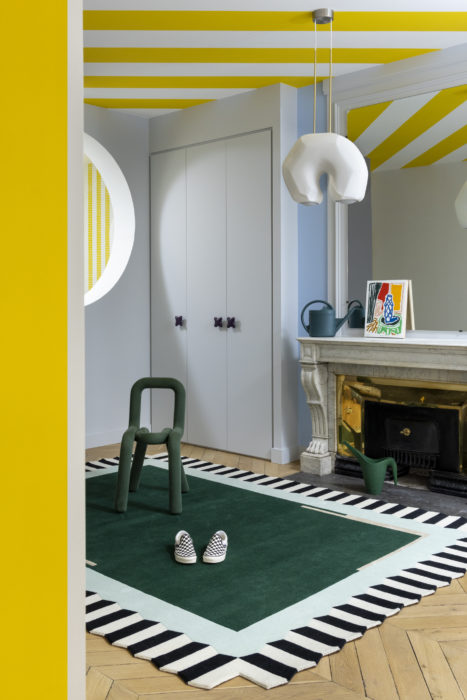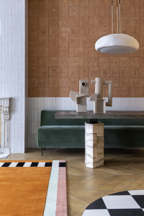 A l’occasion des 10 ans de la marque CC Tapis et des 40 ans de Claude Cartier Décoration, le projet est né dans l’idée d’un graphisme géométrique noir et blanc twisté par la couleur dans une influence Memphis assumée.