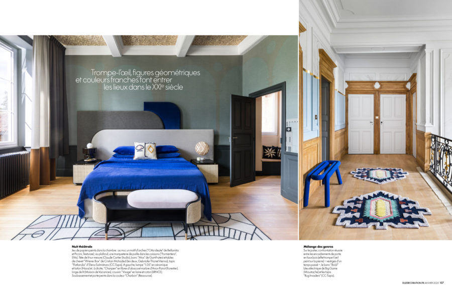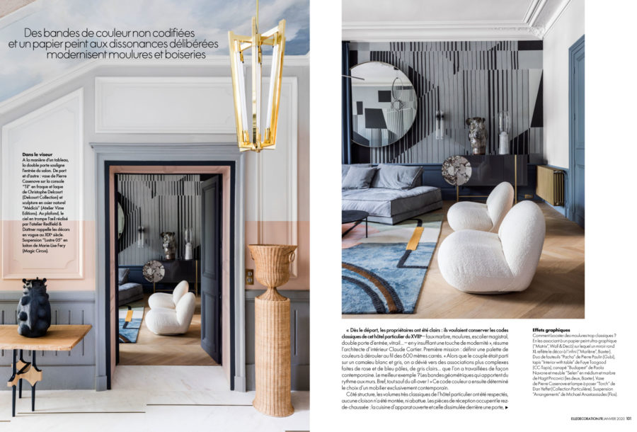 « Dès le départ, les propriétaires ont été clairs : ils voulaient conserver les codes classiques de cet hôtel particulier du XVIIIème- Faux marbre,moulures, escalier magistral, double porte d’entrée, vitrail…- en y insufflant une touche de modernité », résume l’architecte d’intérieur Claude Cartier. Première mission : définir une palette de couleurs à dérouler au fil des 600m². » Alors que le couple était parti sur un camaïeu blanc et gris, on a dévié vers des associations plus complexes faites de rose et de bleu pâles, de gris clairs… que l’on a travaillées de façon contemporaine. Le meilleur exemple? Les bandes géométriques qui apportent du rythme aux murs. Bref, tout sauf du all-over! » Ce code couleur a ensuite déterminé le choix du mobilier exclusivement contemporain.