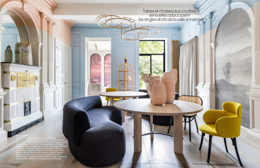 « C’est la pièce bourgeoise par excellence. L’enjeu était de casser les codes. Ma première idée a été de peindre les chapiteaux dans des teintes surprenantes, détaille Claude Cartier. Ma seconde, de repenser l’aménagement de l’espace. Ici une longue table rectangulaire aurait été hors sujet. Même si les propriétaires ont l’habitude de recevoir du monde, souvent ils ne sont que trois ou quatre, un modèle tout en longueur aurait été trop triste. Nous avons imaginé un jeu de deux tables rondes, un peu comme dans un restaurant, entourées de banquettes plutôt que d’innombrables chaises. » Ou comment projeter la pièce de représentation typique du XIXème siècle dans une nouvelle ère. Tout l’enjeu de ce projet en somme.