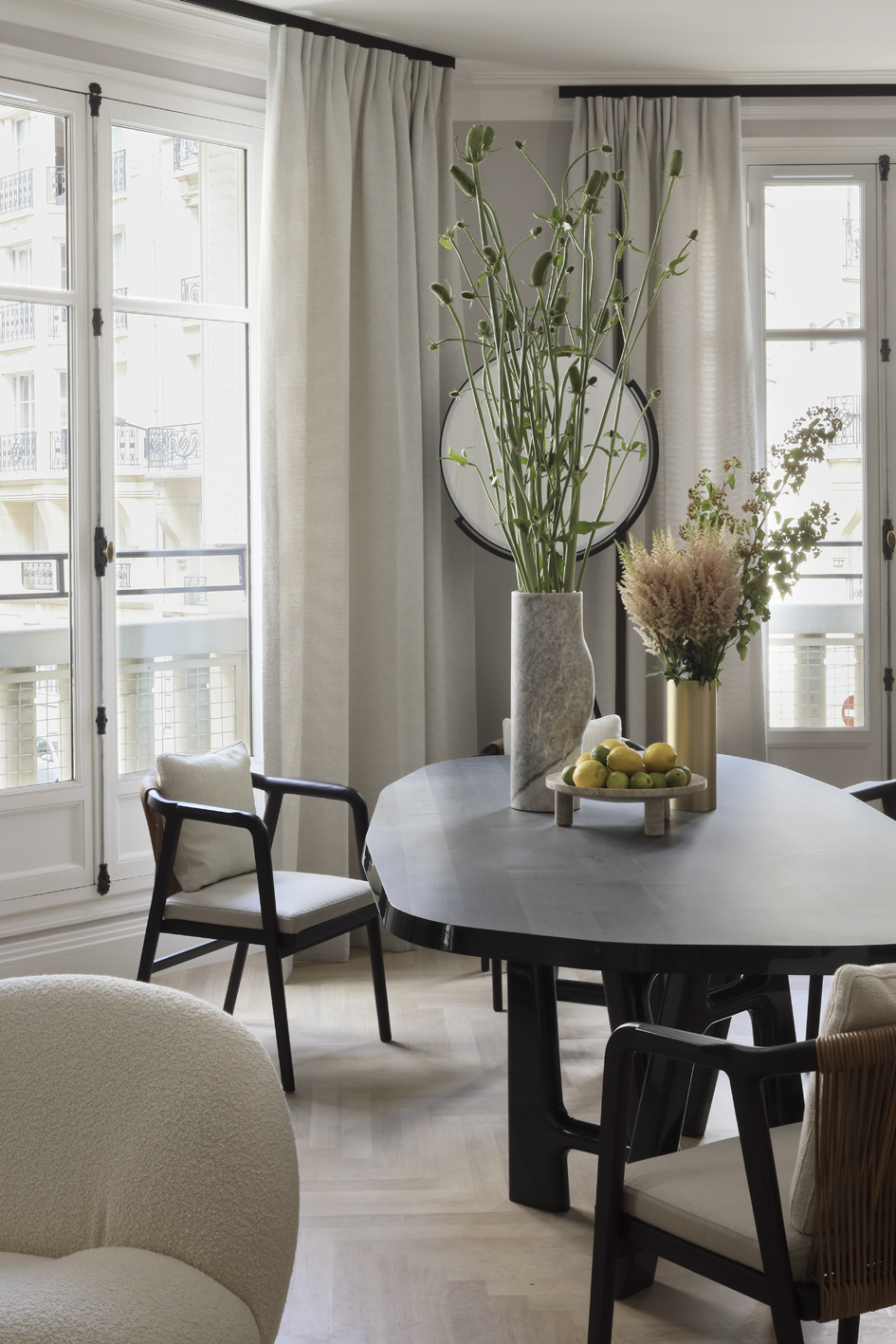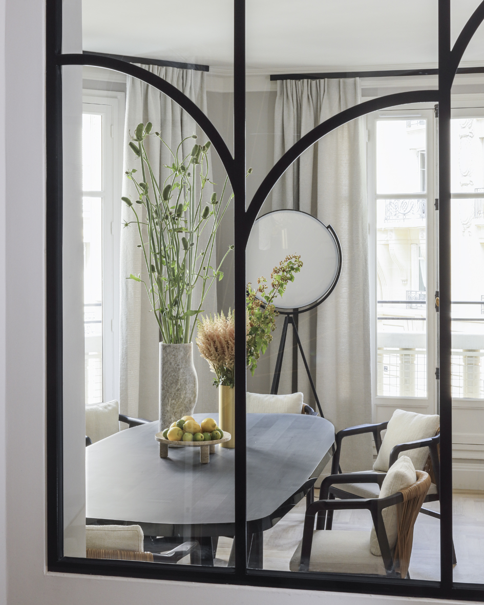La salle à manger se voit dès l’entrée au travers de la verrière Art Déco. Quelle autre table aurait pu être plus intéressante que la YBU de Christophe Delcourt, comme une sculpture elle apporte de la chaleur d’une forme libre et le matériau bois d’un épicéa brossé mélangé à la laque noire profonde.