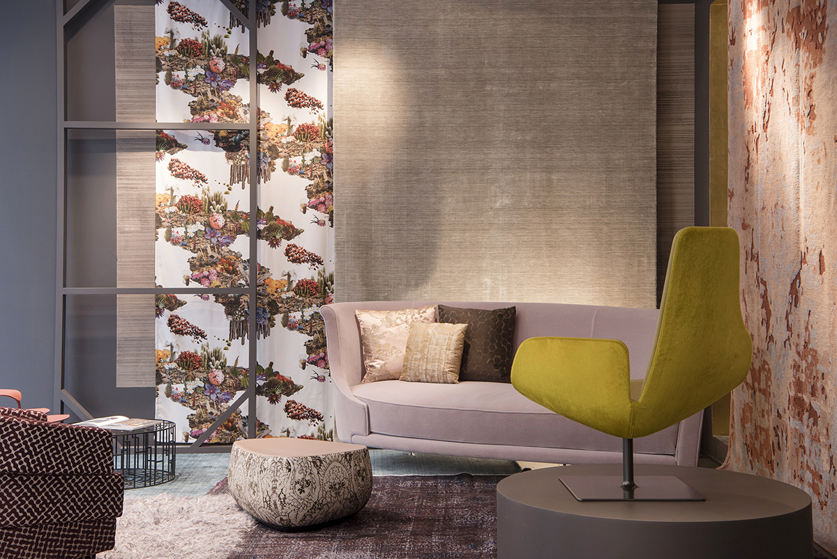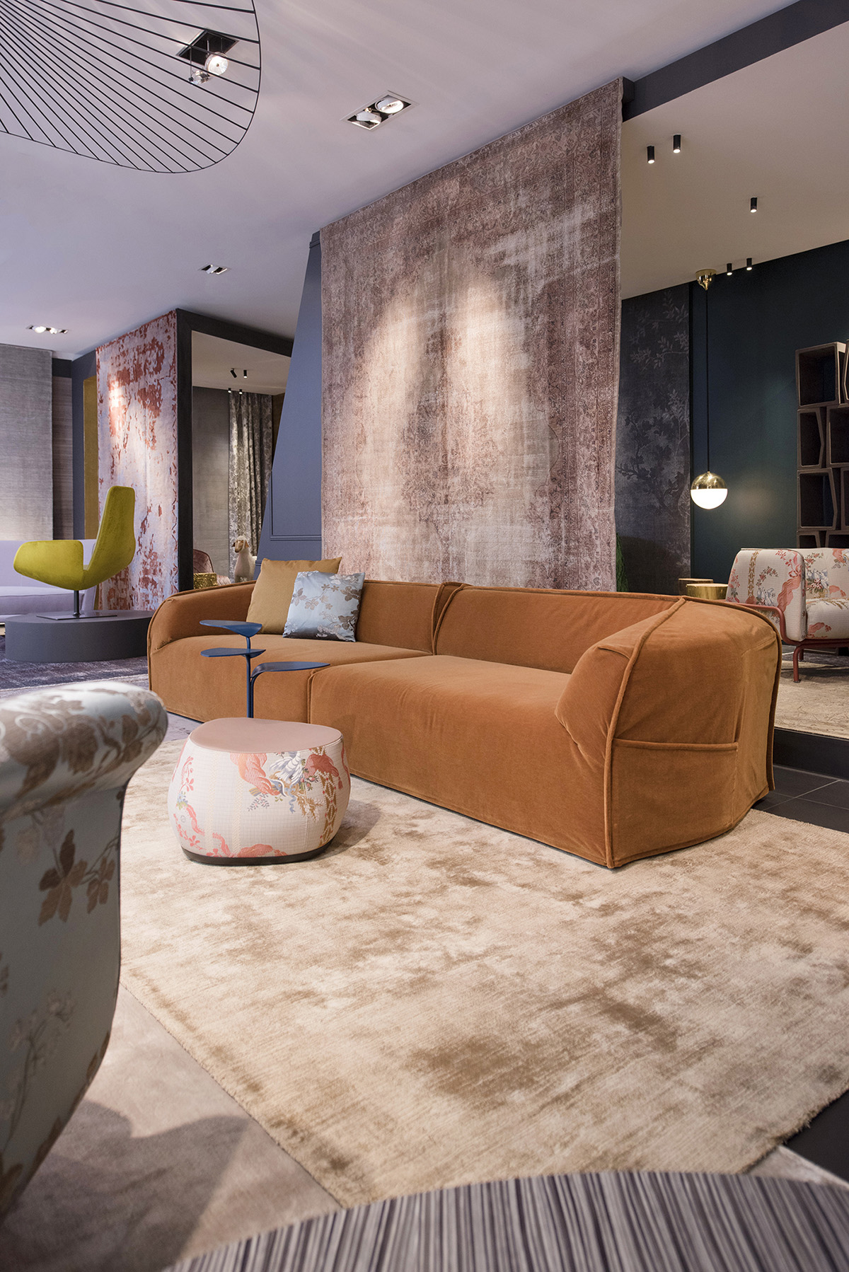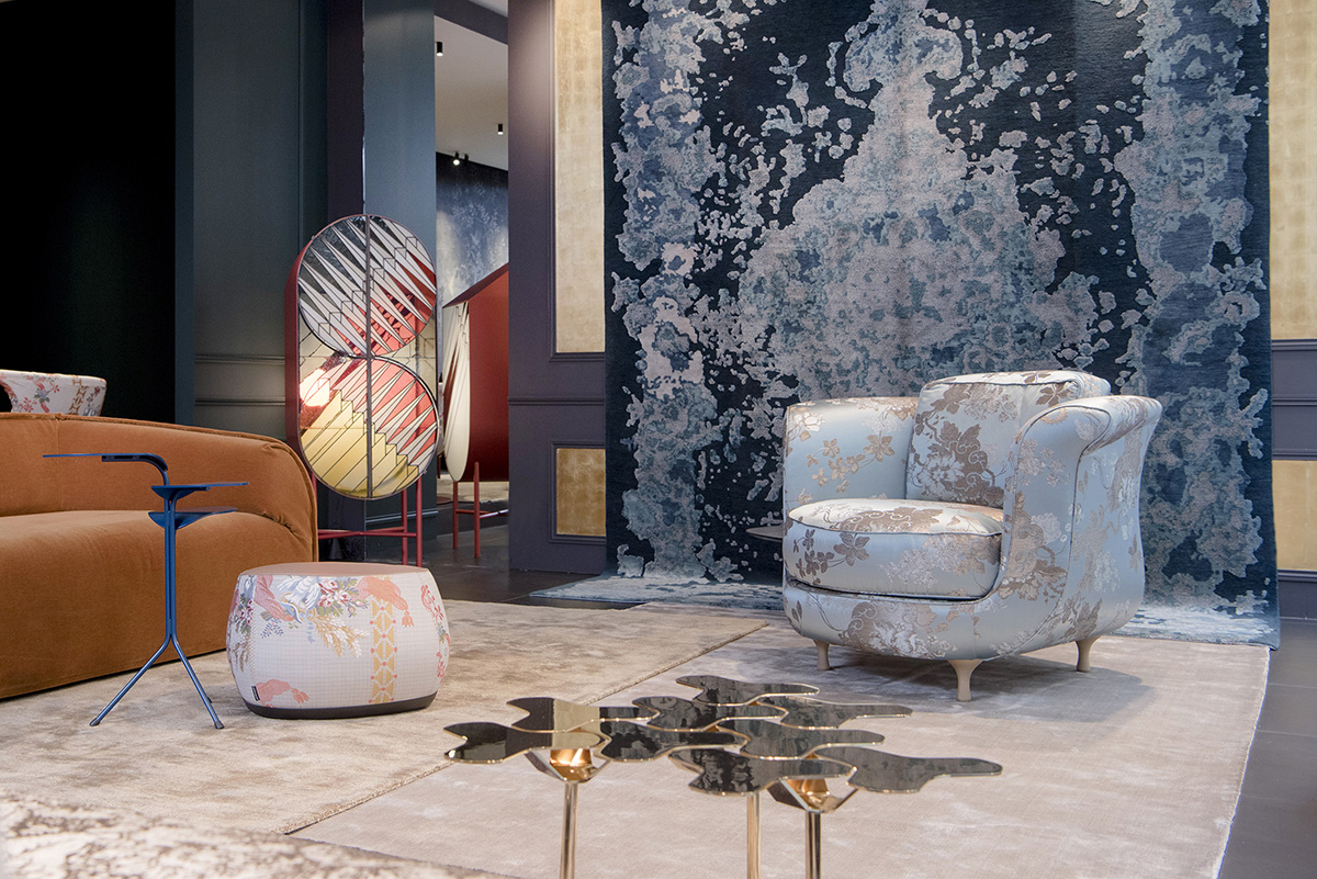 À la tradition des soies et des précieux brocarts de Rubelli s’oppose la texture raffinée des laines et des velours de la collection Kvadrat/Raf Simons tout comme aux réalisations typiquement industrielles s’alternent les façonnages artisanaux les plus élaborés.
