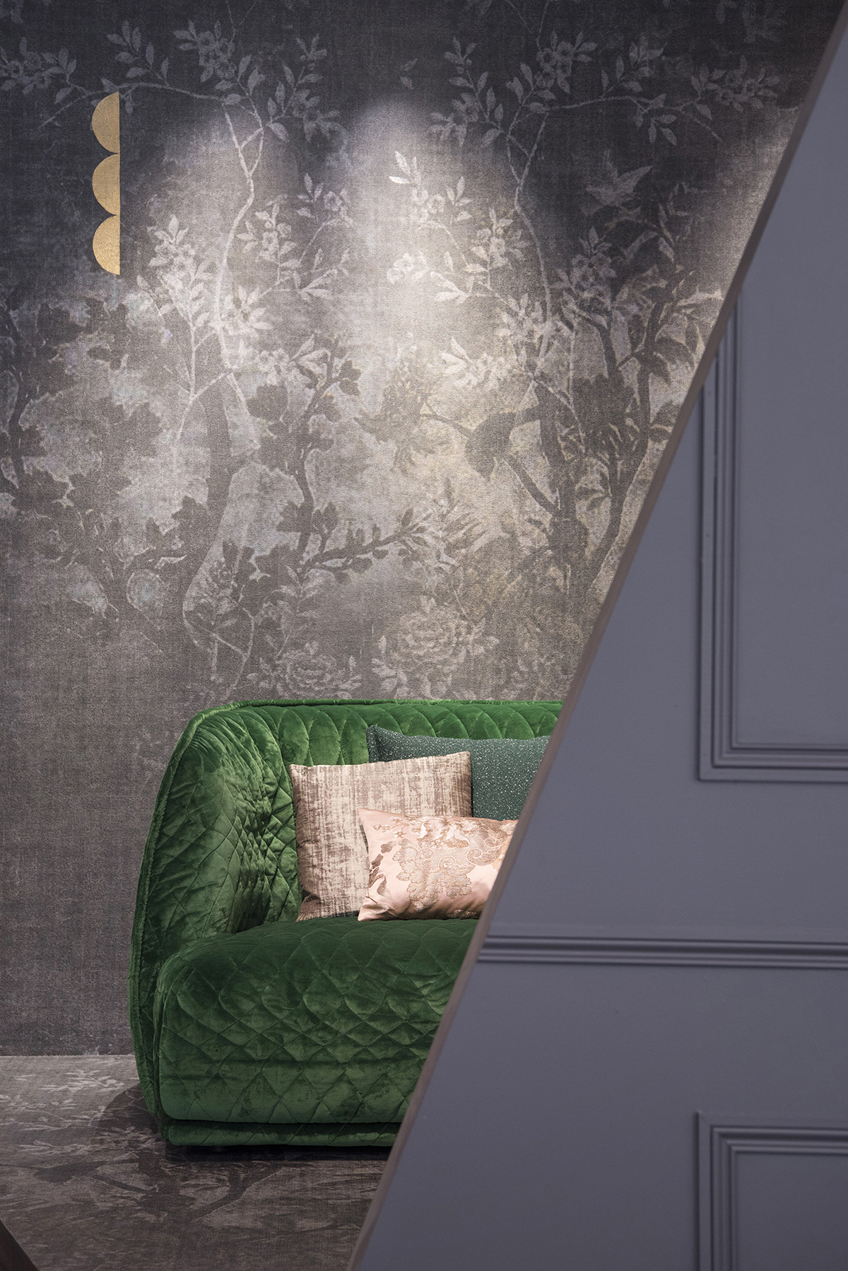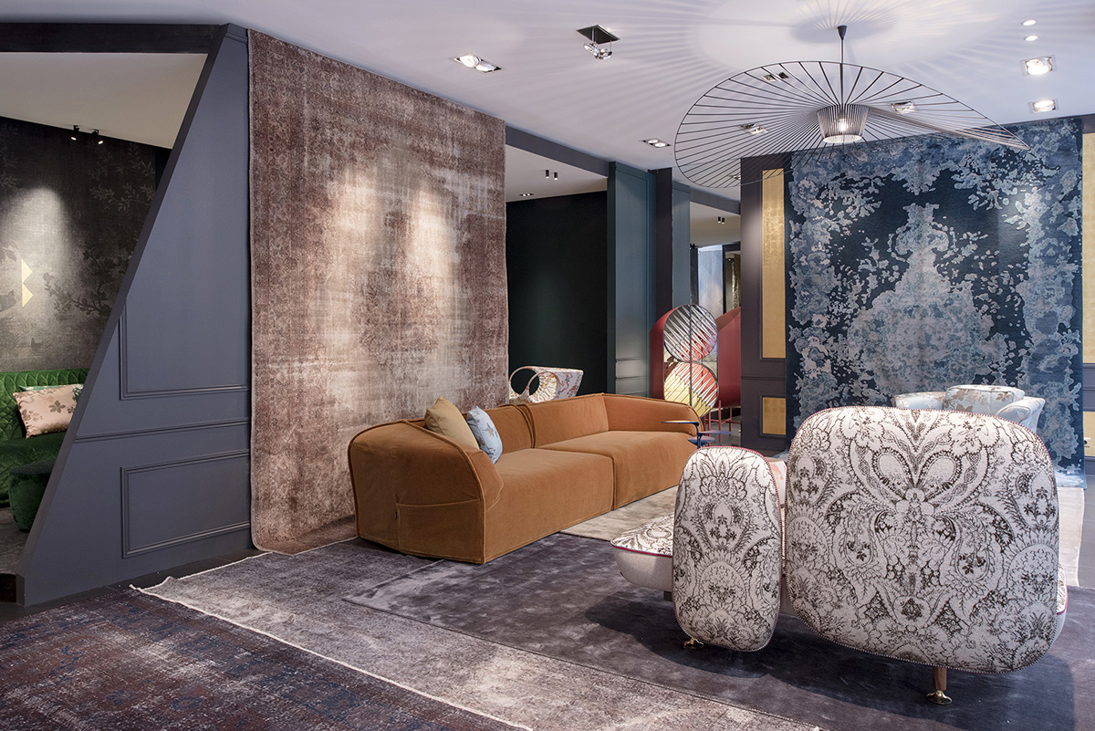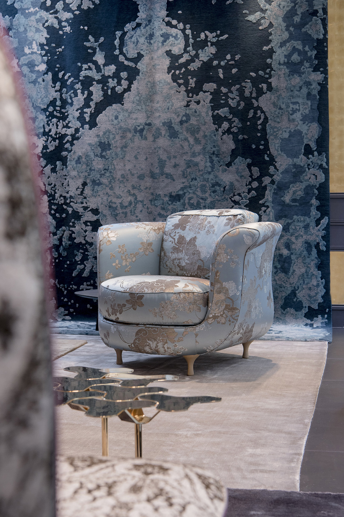 À la tradition des soies et des précieux brocarts de Rubelli s’oppose la texture raffinée des laines et des velours de la collection Kvadrat/Raf Simons tout comme aux réalisations typiquement industrielles s’alternent les façonnages artisanaux les plus élaborés.