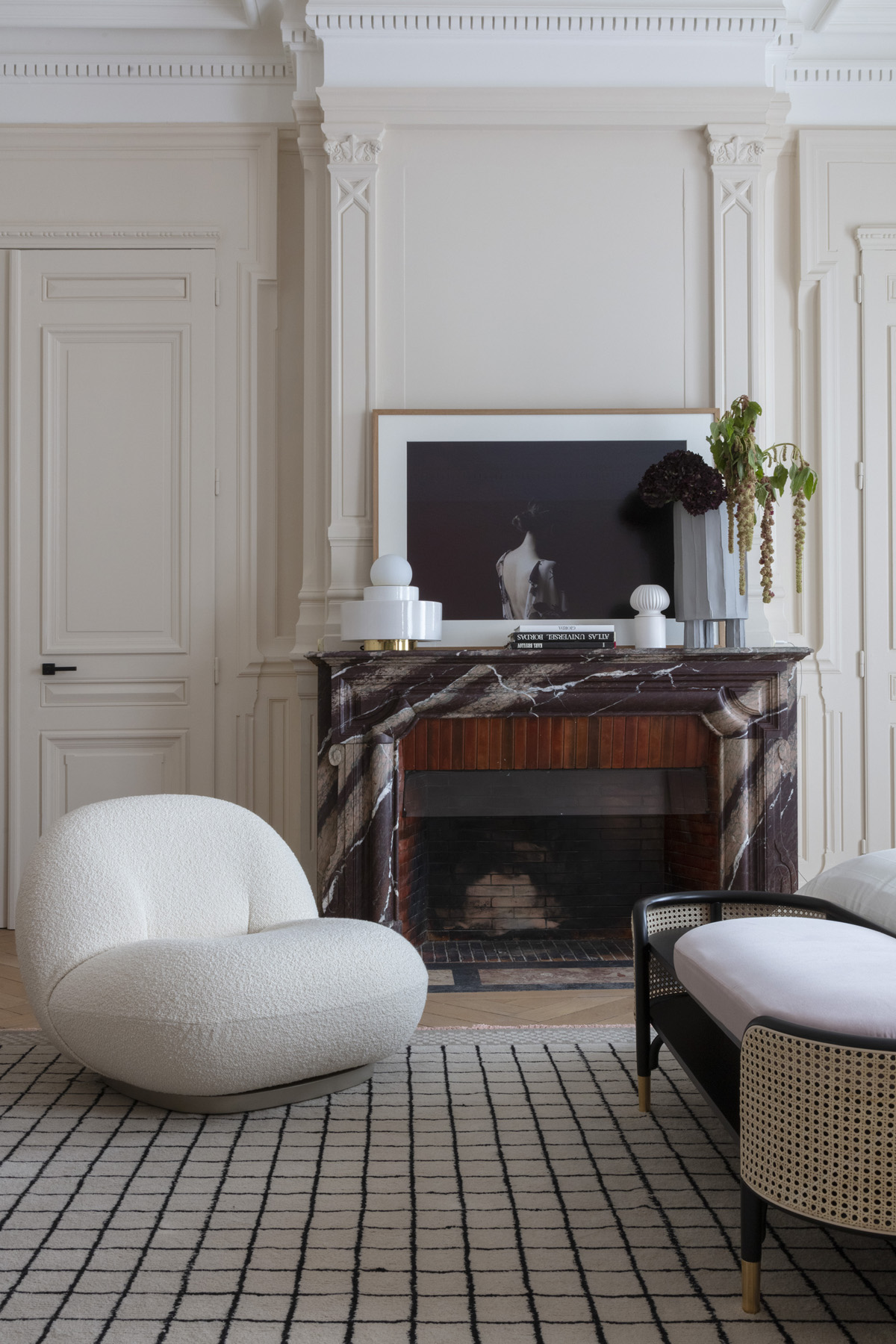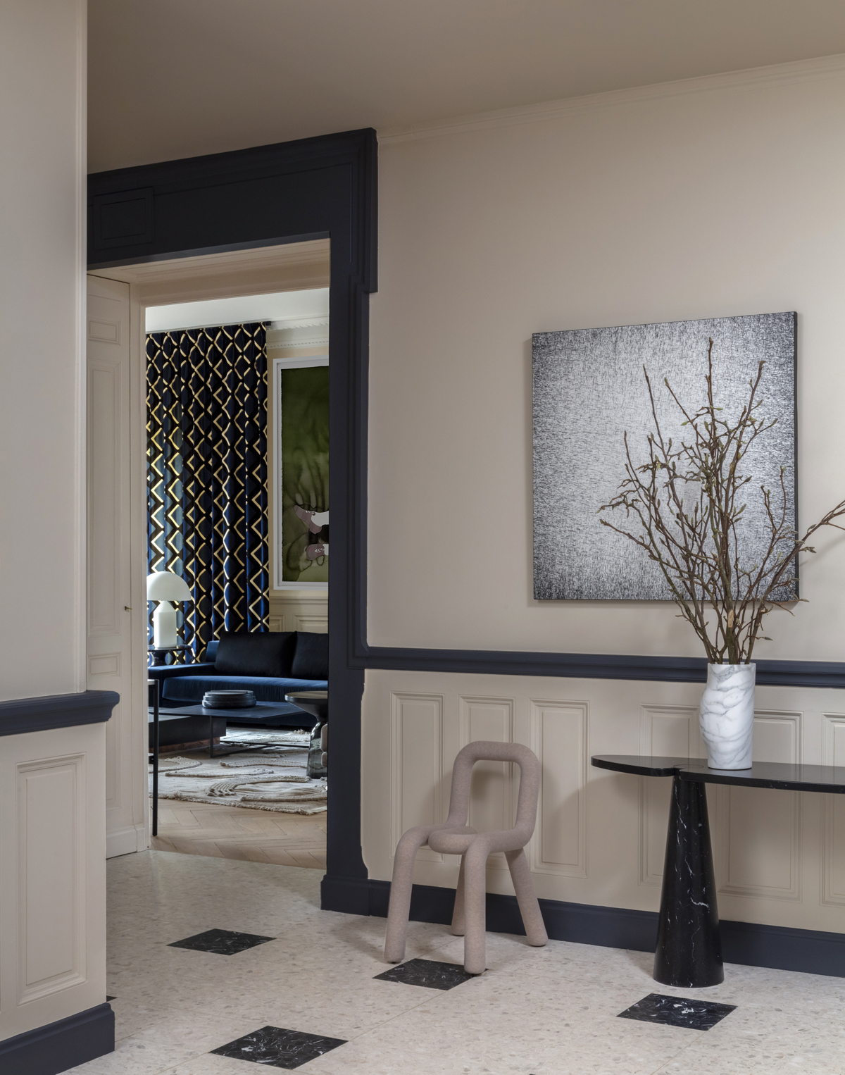 L’entrée si atypique avec son volume XXL devait devenir une pièce à vivre mais aussi délivrer dès le début le message stylistique de l’appartement. On imagine pour cet épicentre en réponse au gigantesque dessin de Françoise Petrovitch une banquette et sa table dessins de Christophe Delcourt pou Collection Particulière propice à la lecture ou d’un diner intime format de poche.