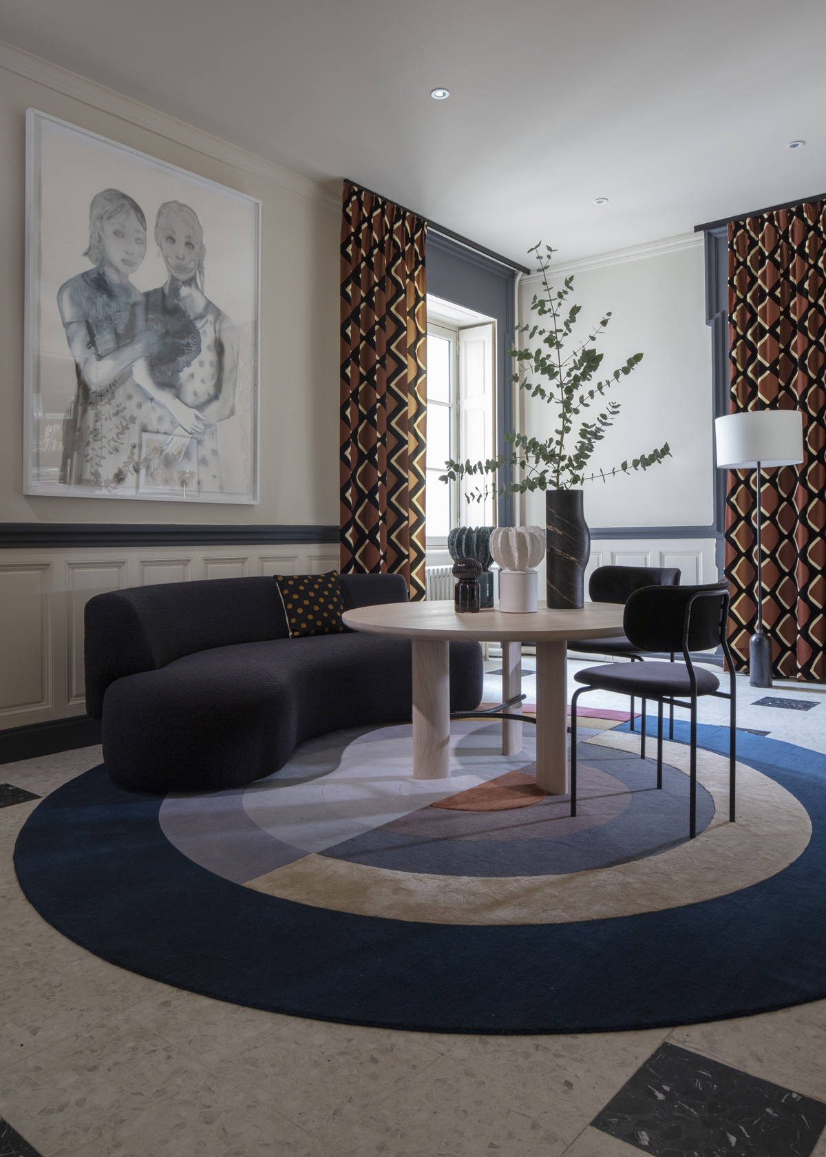 Puis coup de théâtre avec le salon de réception qui surprend avec en premier lieu un autre dessin de Françoise Petrovitch et propose du mobilier invitant au farniente.