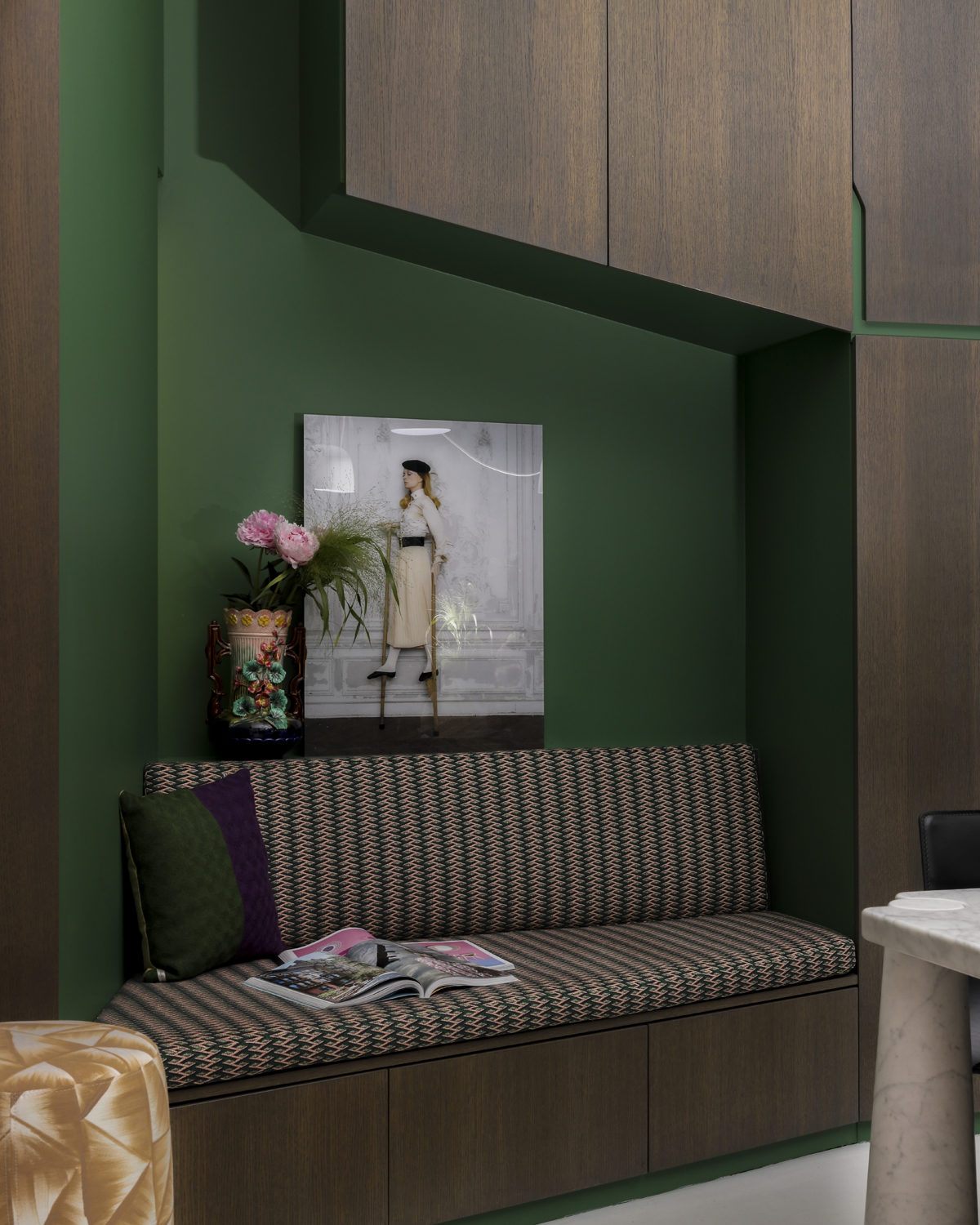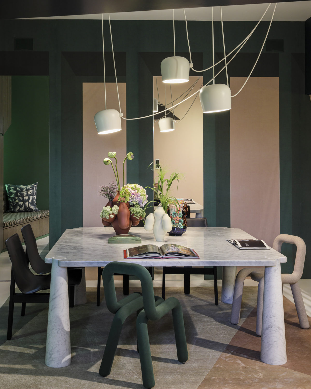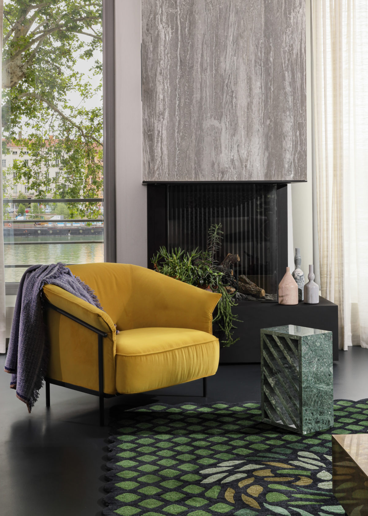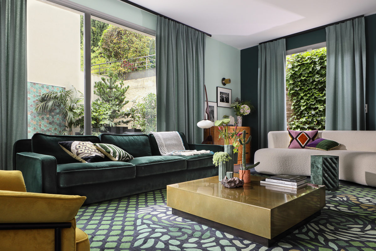 Une palette de verts tendres, vert d’eau, vert menthe répondent aux arbres de l’extérieur et aux subtiles nuances de la Saône. Une cheminée audacieuse, promesse de soirées tranquilles, casse l’alignement des baies vitrées. Une sélection exigeante de mobilier design, coups de coeur des clients correspondent divinement à ce scénario. Table sculpture YBU de Christophe Delcourt, tapis Arty de CC TAPIS et GOLRAN, baquette LEK de Collection Particulière et canapé de Meridiani.
