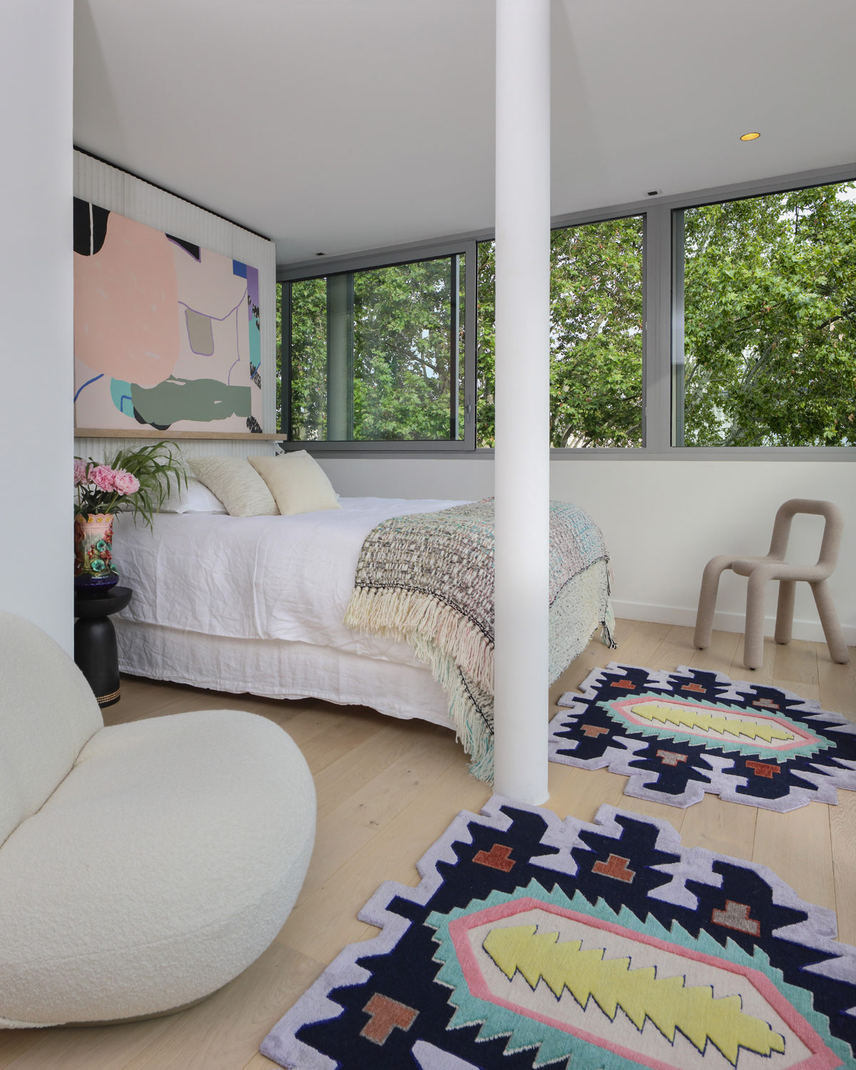 Là plus de couleurs, une palette de dégradés naturels blanc laiteux, lumineux, des matières douces comme le plaid en laine de MOROSO ou la bouclette de laine de Dedar sur le fauteuil Pacha de Pierre Paulin. La salle de bains et sa baignoire XXL parait perdue dans la nature, le sol et son carrelage Palladiana de Studio Pepe déroule une douce géométrie.