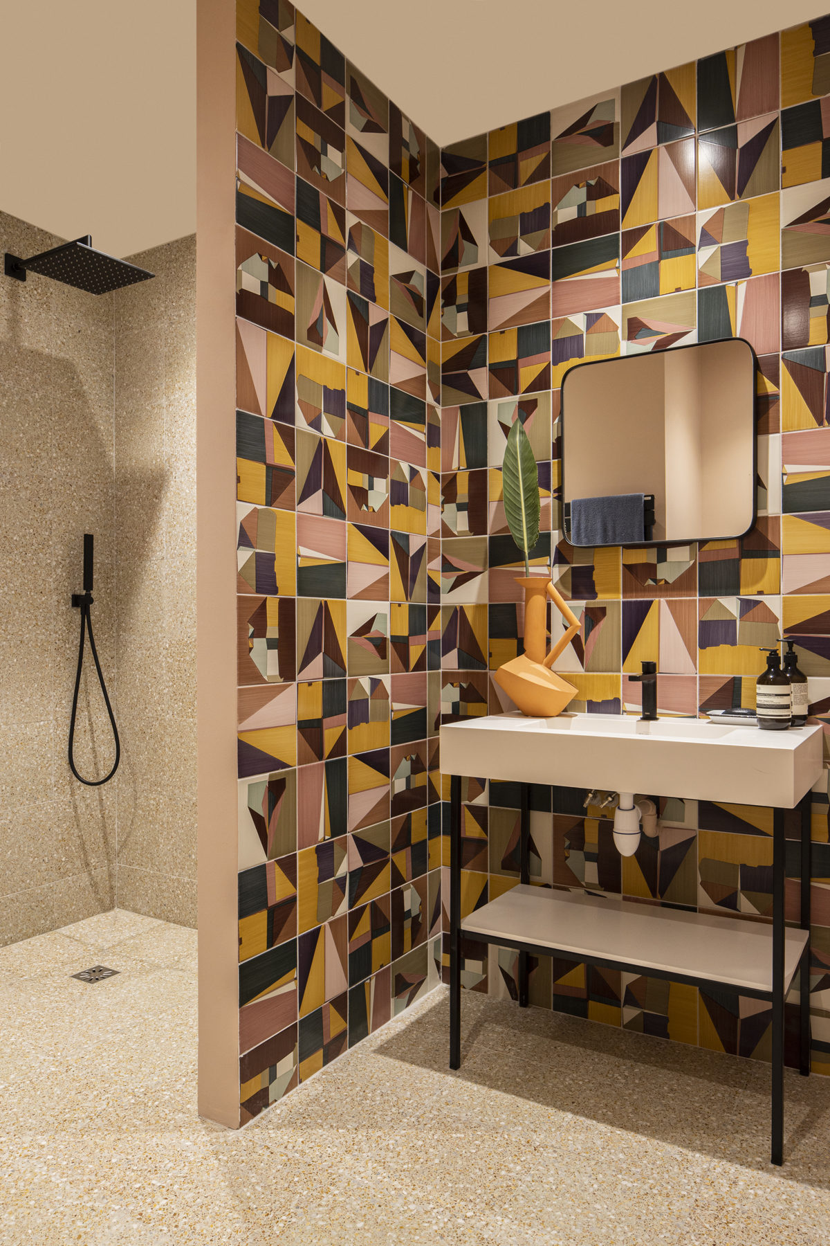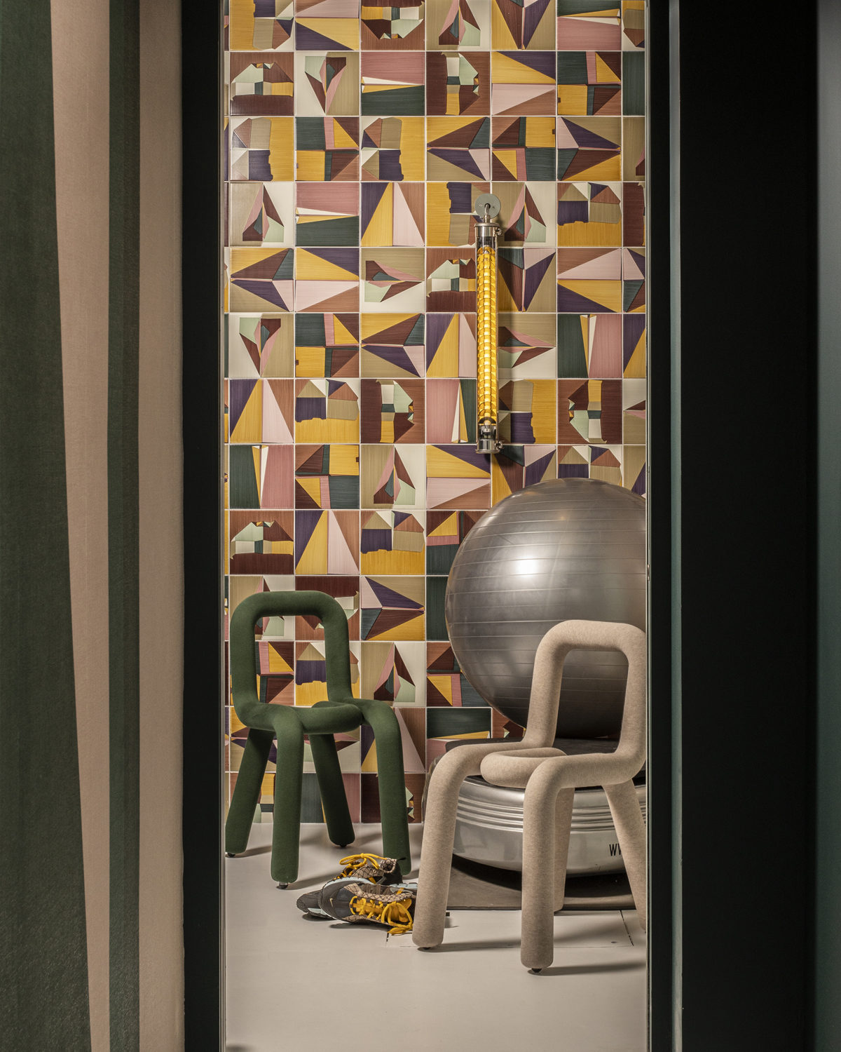 Chaque niveau allait nous donner le tempo à suivre. Le rez de chaussée, presque sans lumière naturelle devait balancer tout de suite la note et donner le ton de la maison. On décide bâtir un scénario s’appuyant sur les géométries déjà existantes et on repart avec en trompe l’oeil le panoramique de Texturae, des couleurs fortes et pop verts et roses cohabitent à une scène joyeuse, design et forte.