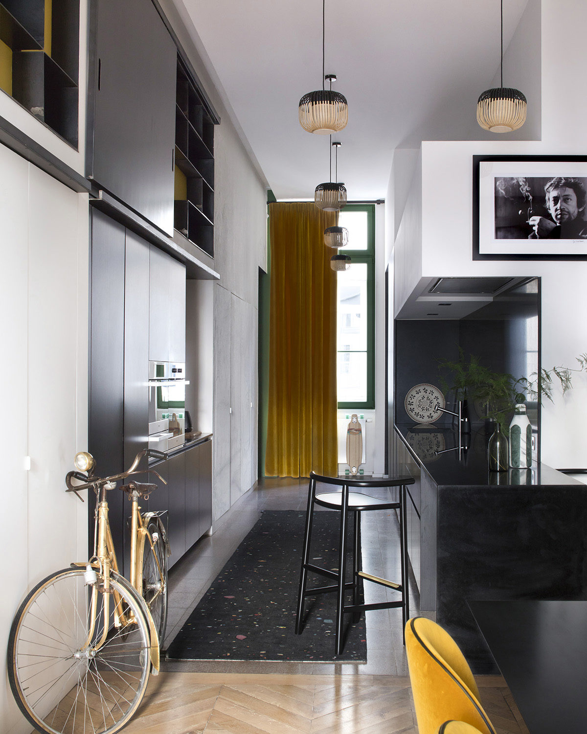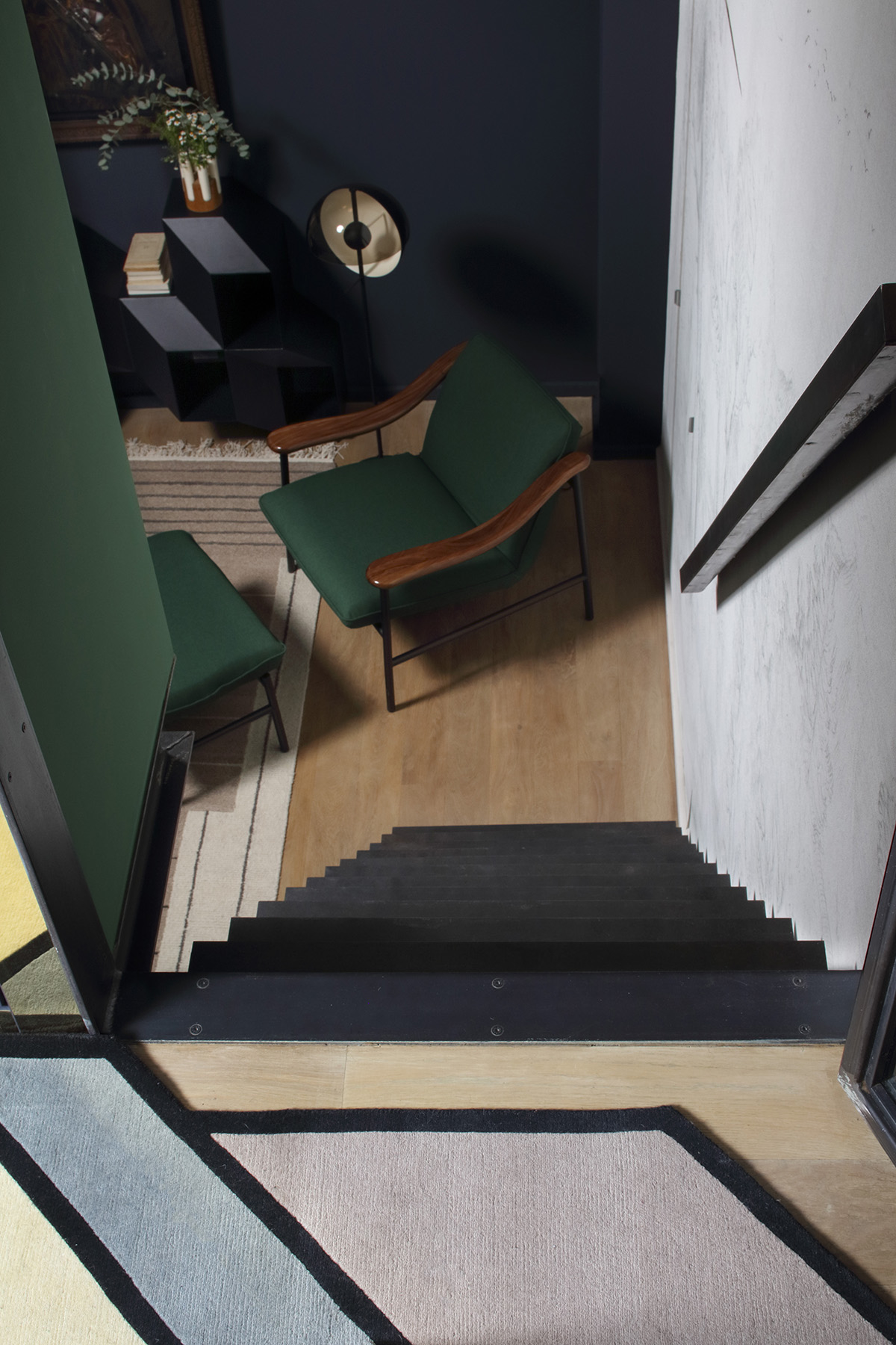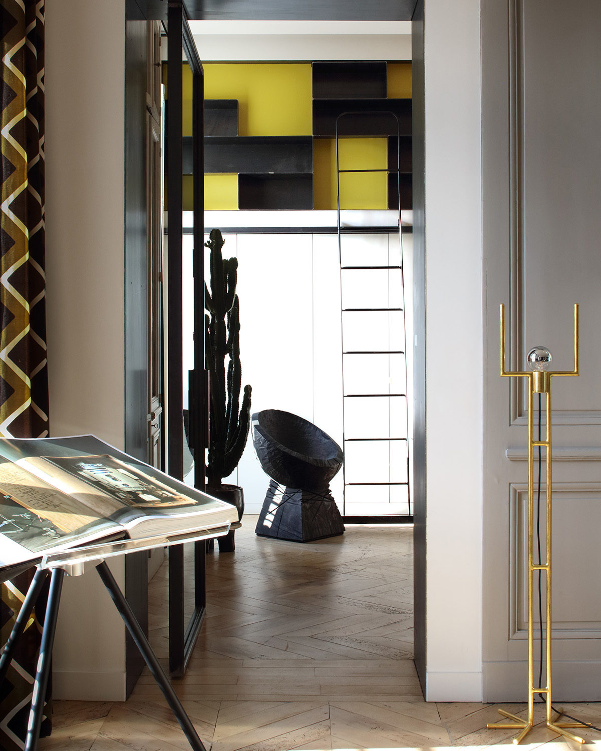 La surface de 250m2 se compose de successions d’espaces aux volumes impressionnants pour les pièces de réception et offre une lecture originale pour la partie nuit, où les chambres ont été construites comme des ”cabanes” de par une hauteur de plafond hors normes.
