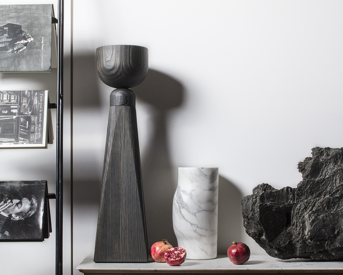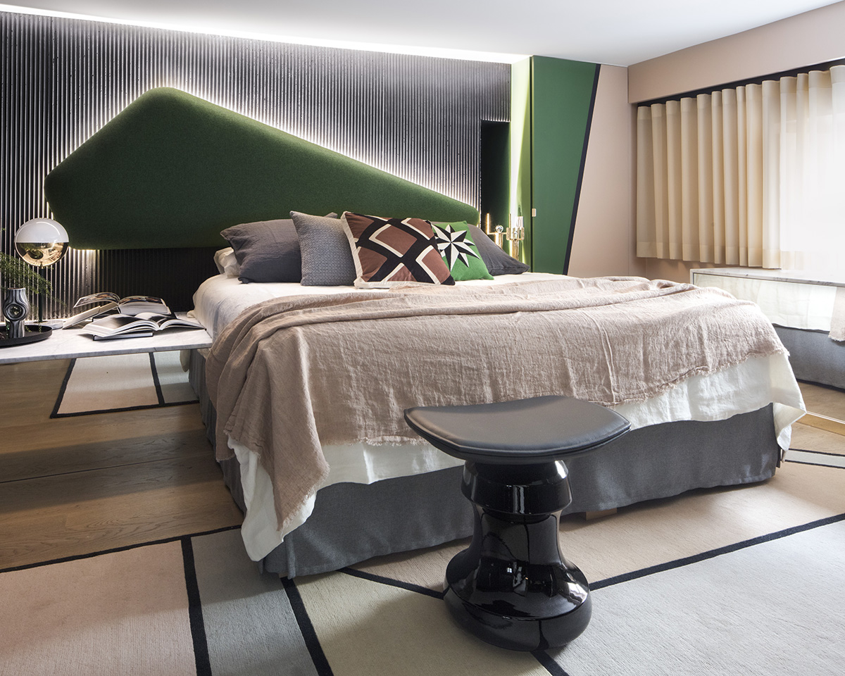La chambre ”cabane” est comme un refuge dans lequel une tête de lit à la géométrie irrégulière a été dessinée pour répondre au dessin du tapis Visioni (Patricia Urquiola pour CC tapis). Le mélange des genres et des matières (Pan béton et laine Kvadrat, marbre et miroir) est ici aussi, au service de l’audace et du confort.