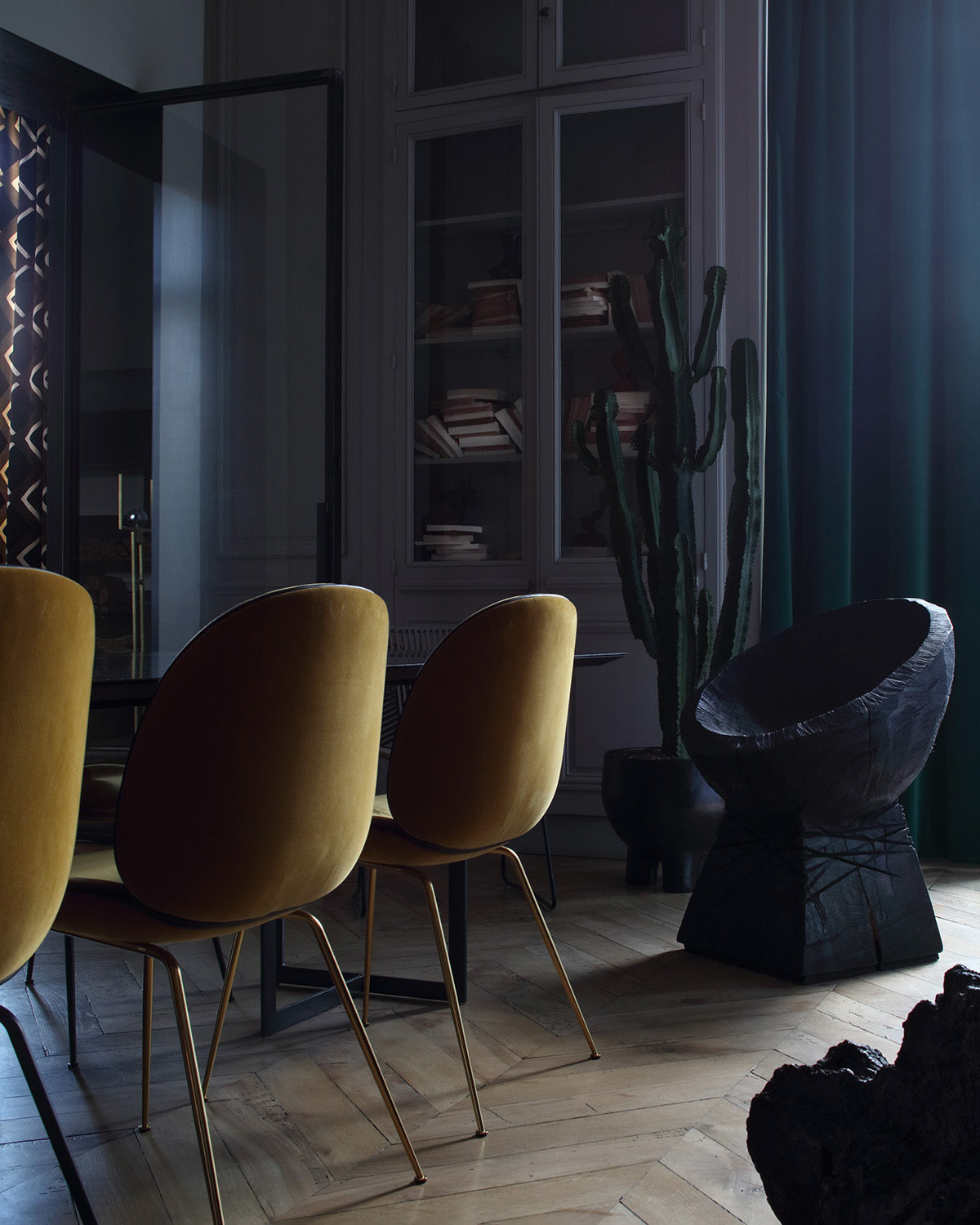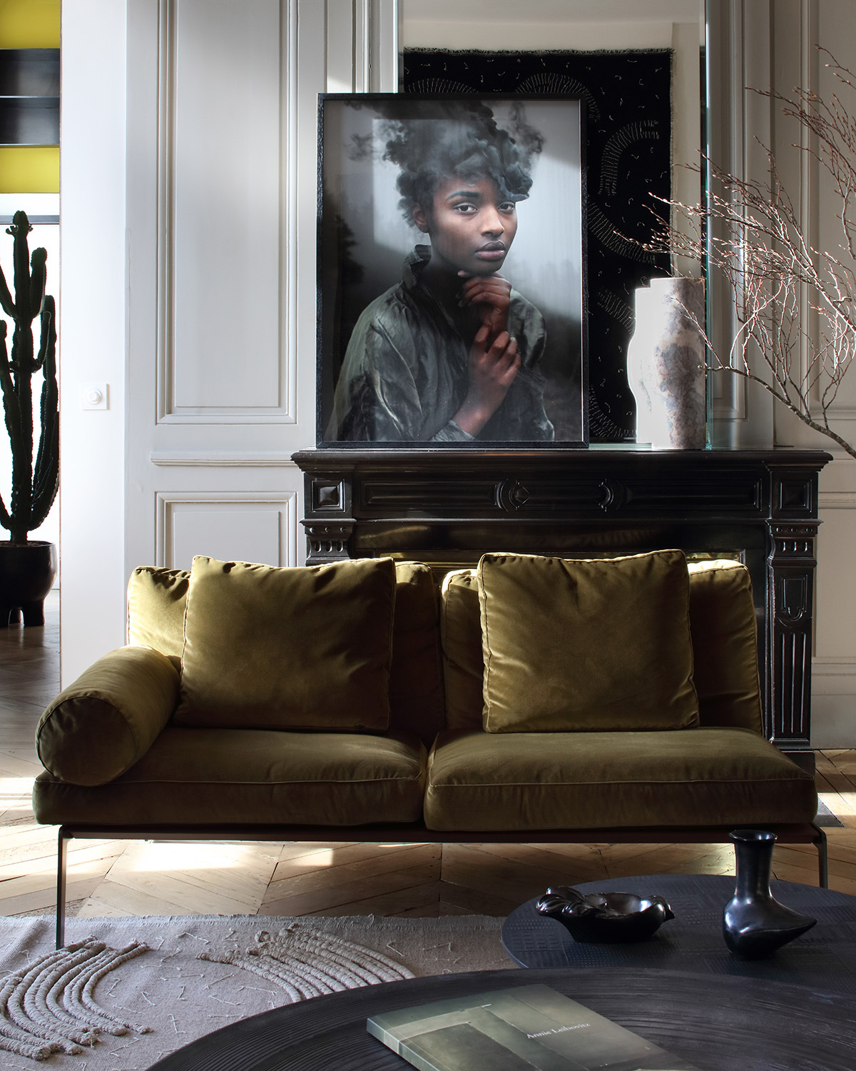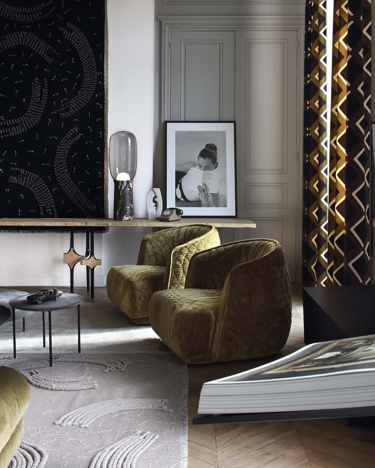 Le coin ”bureau”, scène focus visible dès l’entrée donne le ton avec la présence du fauteuil Russel (Versant Edition) et le jeu de couleurs vitaminées des rideaux en velours Pierre Fray. Claude Cartier Studio a construit ce scénario Arty pour accueillir et valoriser la collection sensible de photographies de son propriétaire.
