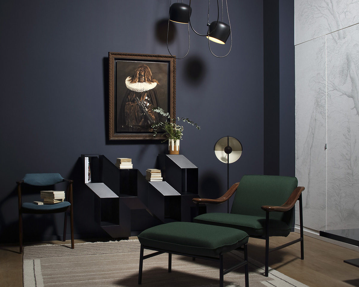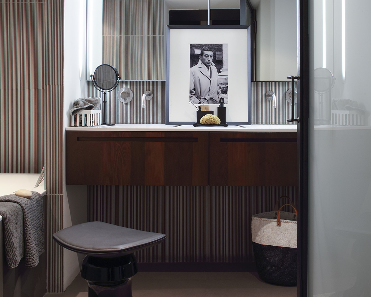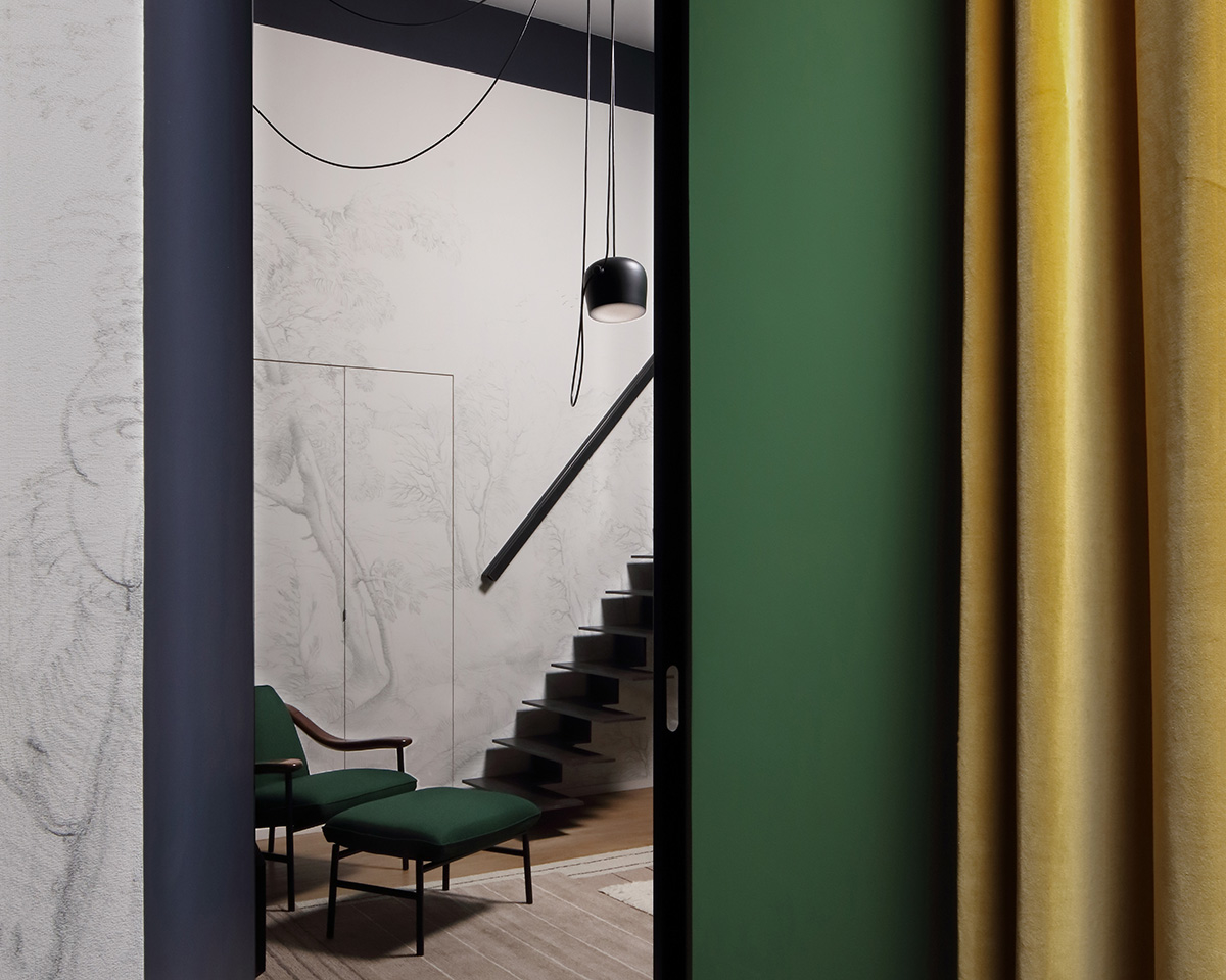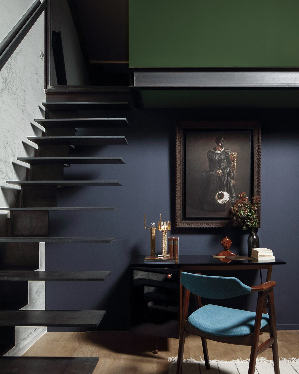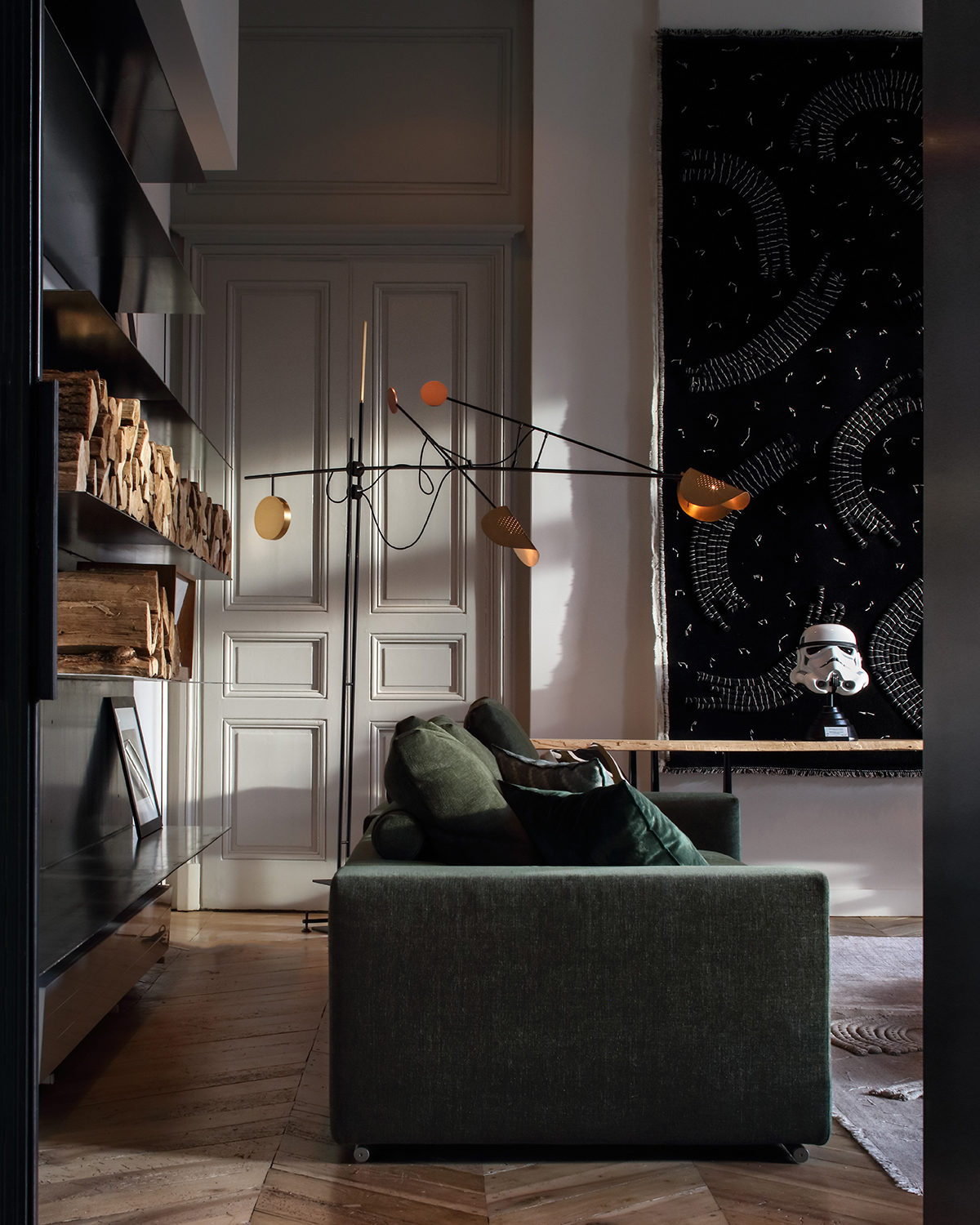 Des le départ, on entre en prise directe avec la cuisine et la salle à manger en enfilade puis le grand salon. L’enjeu était de donner du caractère et de la chaleur à une base un peu plus neutre. Le parti pris des couleurs marquantes mais aussi des papiers peints panoramiques, différencient l’espace nuit, des espaces jours permettant cette singularisation. Les Bleus nuits sourds se heurtent au vert ”Cartier” spécialement conçus par Ressources pour ce chantier, définissent une ambiance masculine, qui était l’enjeu de ce pieds à terre d’un homme d’affaire collectionneur.
